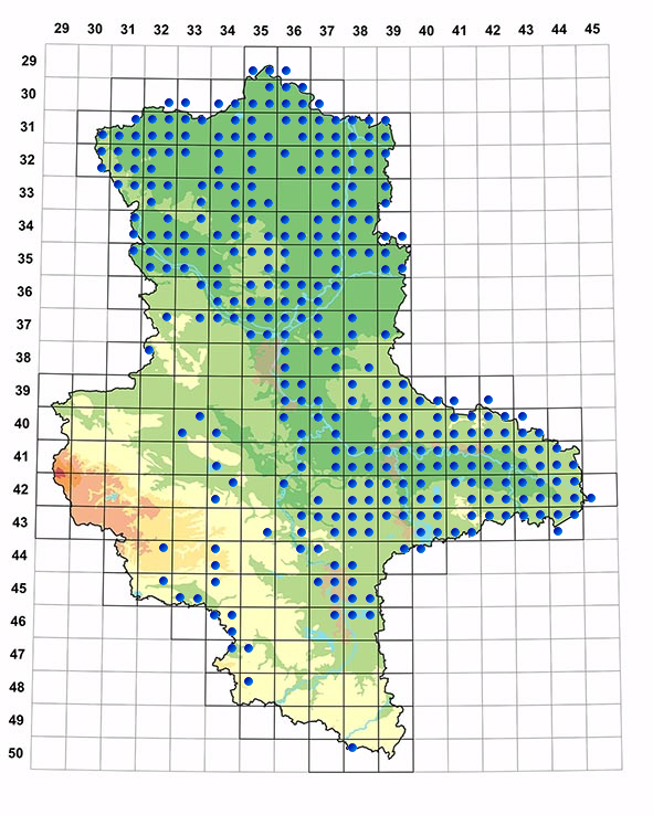 Um das Verbreitungsgebiet der Art in Sachsen-Anhalt sowie dessen mögliche Veränderungen erfassen zu können, werden alle Präsenznachweise (z.B. aus gezielten Kartierungen) gesammelt und auf Basis des 10-km-LAEA-Rasters dargestellt. Als Verbreitungsgebiet gilt dann die gesamte Fläche der „positiven“ 10-km-Raster, d.h. mit mindestens einem aktuellen Präsenznachweis. Die Erfassung der Nachweise erfolgt laufend, die Auswertung zum Ende des jeweiligen Berichtszeitraumes.