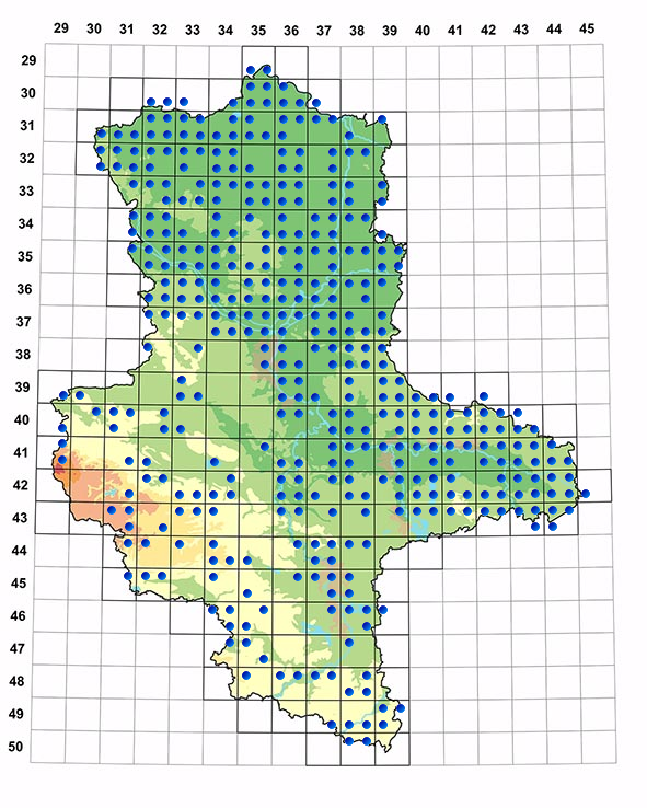 Um das Verbreitungsgebiet der Art in Sachsen-Anhalt sowie dessen mögliche Veränderungen erfassen zu können, werden alle Präsenznachweise (z.B. aus gezielten Kartierungen) gesammelt und auf Basis des 10-km-LAEA-Rasters dargestellt. Als Verbreitungsgebiet gilt dann die gesamte Fläche der „positiven“ 10-km-Raster, d.h. mit mindestens einem aktuellen Präsenznachweis. Die Erfassung der Nachweise erfolgt laufend, die Auswertung zum Ende des jeweiligen Berichtszeitraumes.
