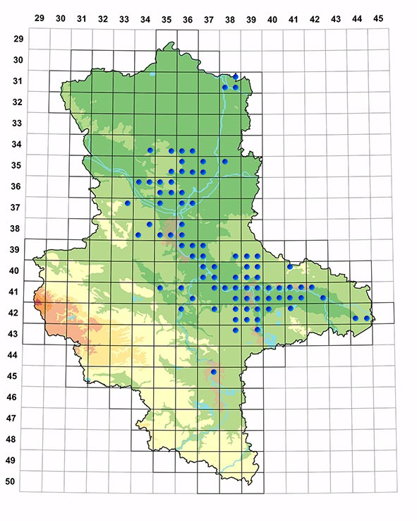 Um das Verbreitungsgebiet der Art in Sachsen-Anhalt sowie dessen mögliche Veränderungen erfassen zu können, werden alle Präsenznachweise (z.B. aus gezielten Kartierungen) gesammelt und auf Basis des 10-km-LAEA-Rasters dargestellt. Als Verbreitungsgebiet gilt dann die gesamte Fläche der „positiven“ 10-km-Raster, d.h. mit mindestens einem aktuellen Präsenznachweis. Die Erfassung der Nachweise erfolgt laufend, die Auswertung zum Ende des jeweiligen Berichtszeitraumes.