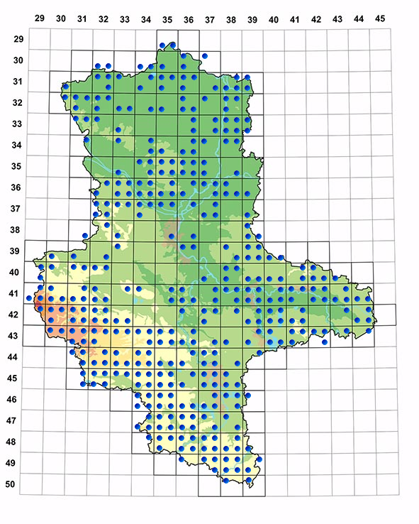 Um das Verbreitungsgebiet der Art in Sachsen-Anhalt sowie dessen mögliche Veränderungen erfassen zu können, werden alle Präsenznachweise (z.B. aus gezielten Kartierungen) gesammelt und auf Basis des 10-km-LAEA-Rasters dargestellt. Als Verbreitungsgebiet gilt dann die gesamte Fläche der „positiven“ 10-km-Raster, d.h. mit mindestens einem aktuellen Präsenznachweis. Die Erfassung der Nachweise erfolgt laufend, die Auswertung zum Ende des jeweiligen Berichtszeitraumes.
