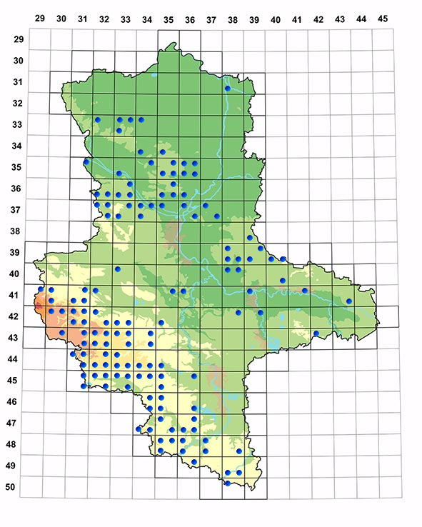 Um das Verbreitungsgebiet der Art in Sachsen-Anhalt sowie dessen mögliche Veränderungen erfassen zu können, werden alle Präsenznachweise (z.B. aus gezielten Kartierungen) gesammelt und auf Basis des 10-km-LAEA-Rasters dargestellt. Als Verbreitungsgebiet gilt dann die gesamte Fläche der „positiven“ 10-km-Raster, d.h. mit mindestens einem aktuellen Präsenznachweis. Die Erfassung der Nachweise erfolgt laufend, die Auswertung zum Ende des jeweiligen Berichtszeitraumes.