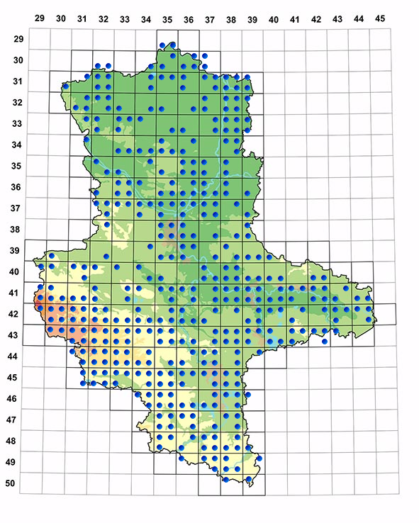 Um das Verbreitungsgebiet der Art in Sachsen-Anhalt sowie dessen mögliche Veränderungen erfassen zu können, werden alle Präsenznachweise (z.B. aus gezielten Kartierungen) gesammelt und auf Basis des 10-km-LAEA-Rasters dargestellt. Als Verbreitungsgebiet gilt dann die gesamte Fläche der „positiven“ 10-km-Raster, d.h. mit mindestens einem aktuellen Präsenznachweis. Die Erfassung der Nachweise erfolgt laufend, die Auswertung zum Ende des jeweiligen Berichtszeitraumes.