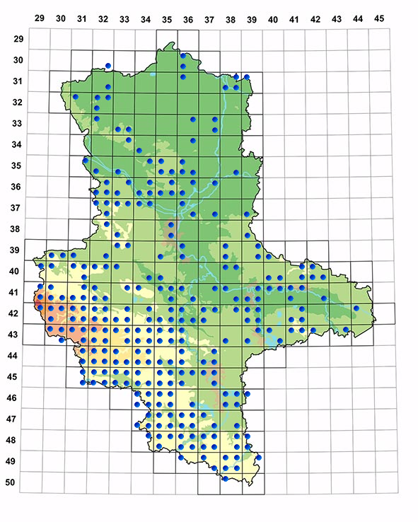 Um das Verbreitungsgebiet der Art in Sachsen-Anhalt sowie dessen mögliche Veränderungen erfassen zu können, werden alle Präsenznachweise (z.B. aus gezielten Kartierungen) gesammelt und auf Basis des 10-km-LAEA-Rasters dargestellt. Als Verbreitungsgebiet gilt dann die gesamte Fläche der „positiven“ 10-km-Raster, d.h. mit mindestens einem aktuellen Präsenznachweis. Die Erfassung der Nachweise erfolgt laufend, die Auswertung zum Ende des jeweiligen Berichtszeitraumes.