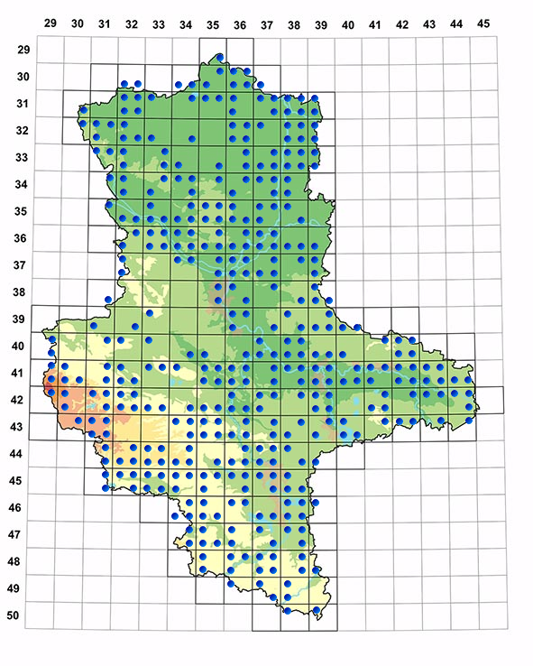 Um das Verbreitungsgebiet der Art in Sachsen-Anhalt sowie dessen mögliche Veränderungen erfassen zu können, werden alle Präsenznachweise (z.B. aus gezielten Kartierungen) gesammelt und auf Basis des 10-km-LAEA-Rasters dargestellt. Als Verbreitungsgebiet gilt dann die gesamte Fläche der „positiven“ 10-km-Raster, d.h. mit mindestens einem aktuellen Präsenznachweis. Die Erfassung der Nachweise erfolgt laufend, die Auswertung zum Ende des jeweiligen Berichtszeitraumes.