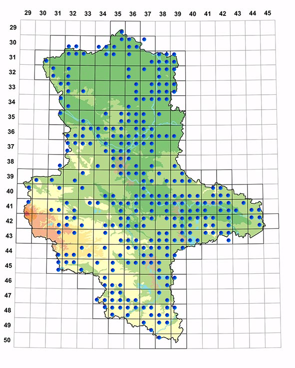 Um das Verbreitungsgebiet der Art in Sachsen-Anhalt sowie dessen mögliche Veränderungen erfassen zu können, werden alle Präsenznachweise (z.B. aus gezielten Kartierungen) gesammelt und auf Basis des 10-km-LAEA-Rasters dargestellt. Als Verbreitungsgebiet gilt dann die gesamte Fläche der „positiven“ 10-km-Raster, d.h. mit mindestens einem aktuellen Präsenznachweis. Die Erfassung der Nachweise erfolgt laufend, die Auswertung zum Ende des jeweiligen Berichtszeitraumes.