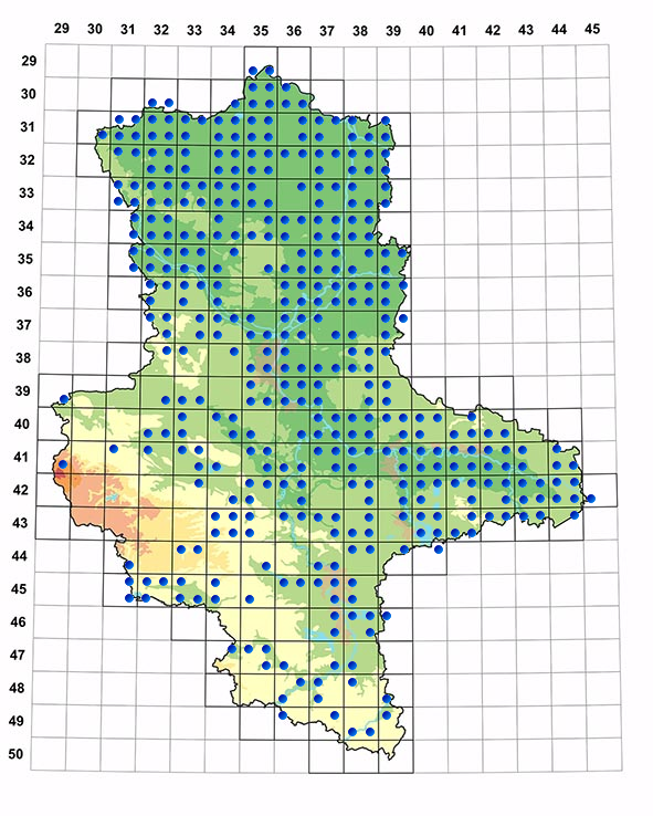 - Landesweit sind ca. 860 festgelegte SPO zu untersuchen. Als besonders geeignet gelten z.B. Brücken, Gewässerzusammenflüsse und prominente Uferstrukturen. Ursprünglich wurden 4-6 SPO pro TK25 (MTB) festgelegt (Binner et al. 2003). Diese wurden nachfolgend auf die 10 x 10 km-Rasterfelder des EEA-Grids übertragen, wobei gelegentlich Anpassungen/Ergänzungen zur Wahrung der Repräsentanz pro Rasterfeld nötig waren. Die SPO sollen so verteilt sein, dass die Nachweiswahrscheinlichkeit hoch ist und zugleich eine möglichst gleichmäßige räumliche Verteilung erreicht wird. Bei unvollständigen Rasterfeldern ist die Zahl der SPO anteilig verringert.