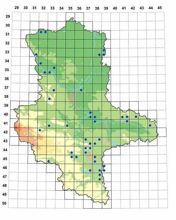 Die Lage der historischen Nachweisorte zeichnet im Wesentlichen das Einzugsgebiet ansässiger Sammler ab. Dabei zeigt sich eine Fundorthäufung im Raum Magdeburg, Haldensleben, Burg und Staßfurt (REGIUS 1930, 1966; REINHARDT 1874) sowie Halle, Bitterfeld bis Bad Kösen (GOLDFUß 1900). In der zweiten Hälfte des letzten Jahrhunderts kamen Fundorte für den Saalekreis und den Landkreis Mansfeld-Südharz hinzu (u.a. KÖRNIG 1981, 1988).